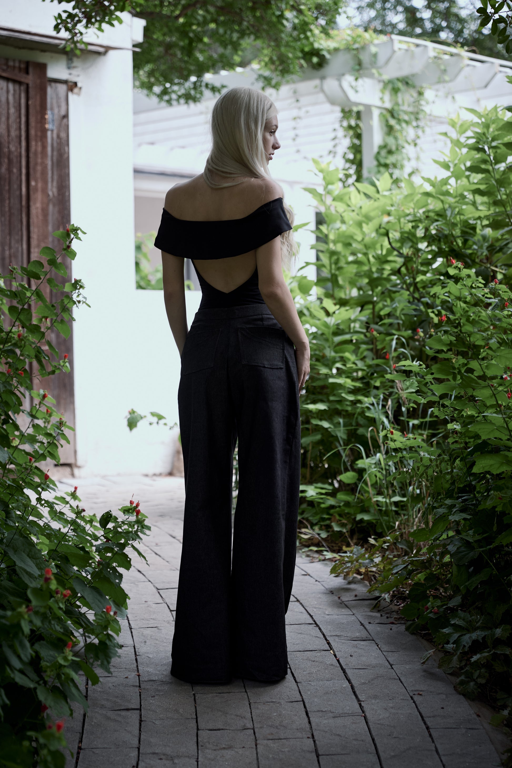 This short sleeve backless bodysuit has a silk neckline to sit off the shoulder or partially on. The body is made of a buttery soft viscose jersey and features a cut-out in the back.